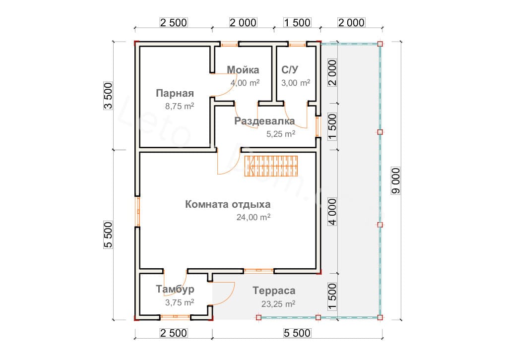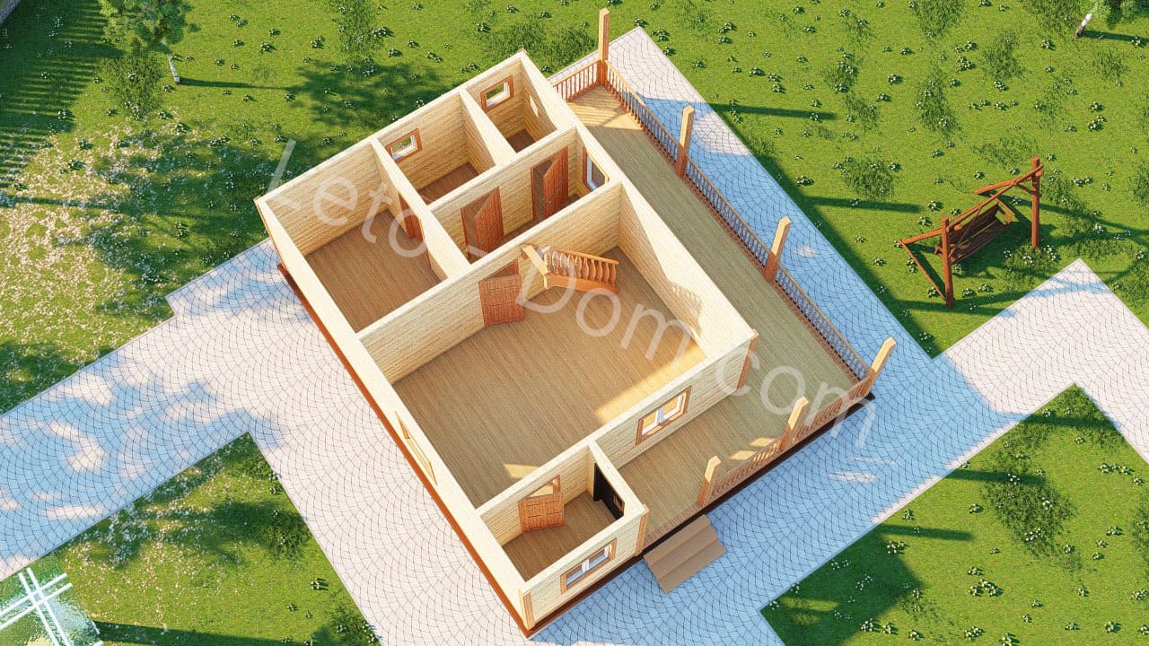 В том случае, если терраса проектом предусмотрена устанавливаются опорные столбы из строганного бруса сечением 150х150 мм. Для равномерной компенсации усадки устанавливаются усадочные болты. На террасе изготавливается ограждение и поручни из строганой доски сечением 40х100 мм. Потолок на террасе подшивается имитацией бруса сечением 18х140 мм (камерной сушки). Пол строганная доска сечением 40х100 мм, через каждую доску оставляется зазор 5 мм. На входе на террасу, устанавливаются ступени.