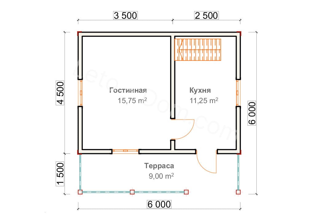 В том случае, если терраса проектом предусмотрена устанавливаются опорные столбы из строганного бруса сечением 150х150 мм. Для равномерной компенсации усадки устанавливаются усадочные болты. На террасе изготавливается ограждение и поручни из строганой доски сечением 40х100 мм. Потолок на террасе подшивается имитацией бруса сечением 18х140 мм (камерной сушки). Пол строганная доска сечением 40х100 мм, через каждую доску оставляется зазор 5 мм. На входе на террасу, устанавливаются ступени.