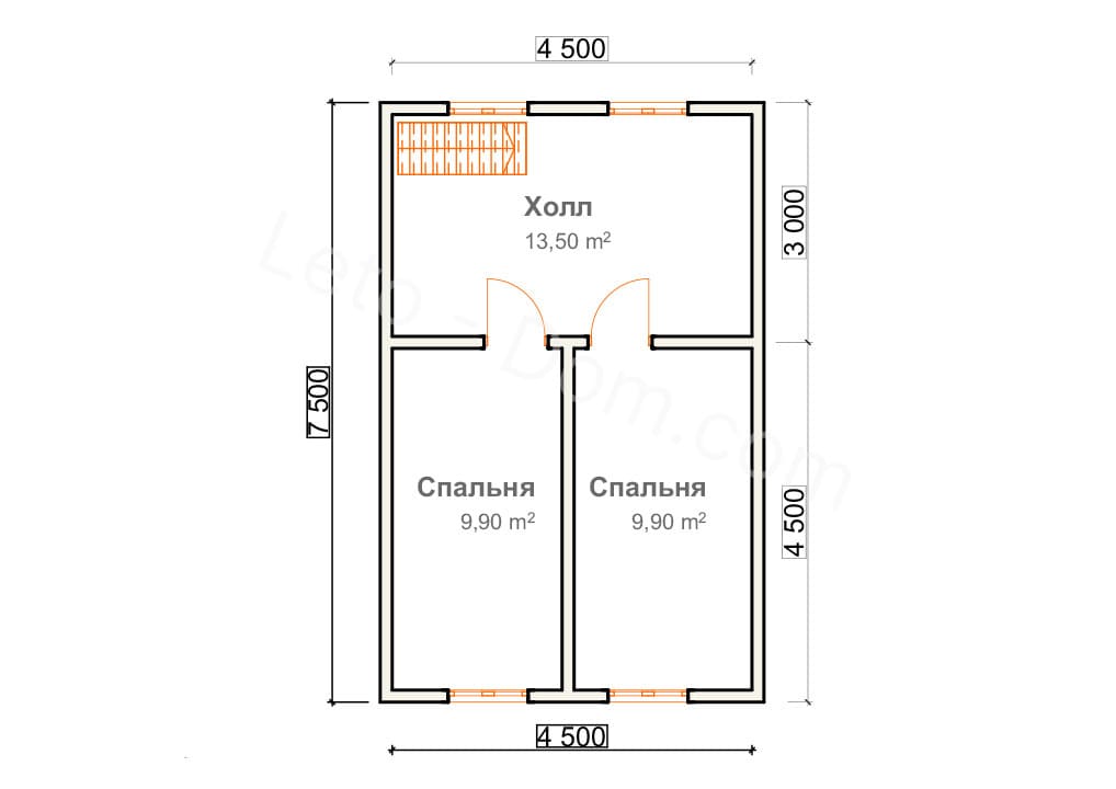 Первый и второй этаж соединяет одномаршевая или двух маршевая лестница (лестницу бригада монтирует на месте).Отделка лестницы выполнена из массива сосны класса "А": тетива, перила – резные, балясины – точеные, устанавливаются стартовые столбы. Ширина ступени лестницы от 250 мм.