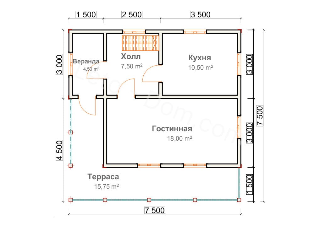 В том случае, если терраса проектом предусмотрена устанавливаются опорные столбы из строганного бруса сечением 150х150 мм. Для равномерной компенсации усадки устанавливаются усадочные болты. На террасе изготавливается ограждение и поручни из строганой доски сечением 40х100 мм. Потолок на террасе подшивается имитацией бруса сечением 18х140 мм (камерной сушки). Пол строганная доска сечением 40х100 мм, через каждую доску оставляется зазор 5 мм. На входе на террасу, устанавливаются ступени.