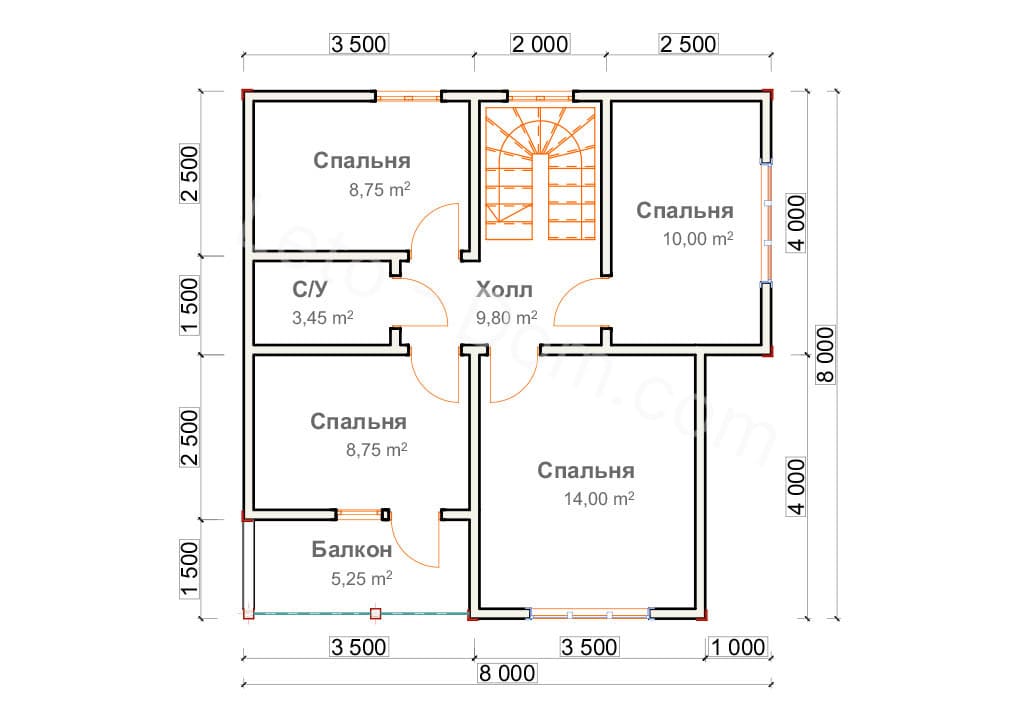 Первый и второй этаж соединяет одномаршевая или двух маршевая лестница (лестницу бригада монтирует на месте).Отделка лестницы выполнена из массива сосны класса "А": Тетива, перила – резные, балясины – точеные, устанавливаются стартовые столбы. Ширина ступени лестницы от 250 мм.